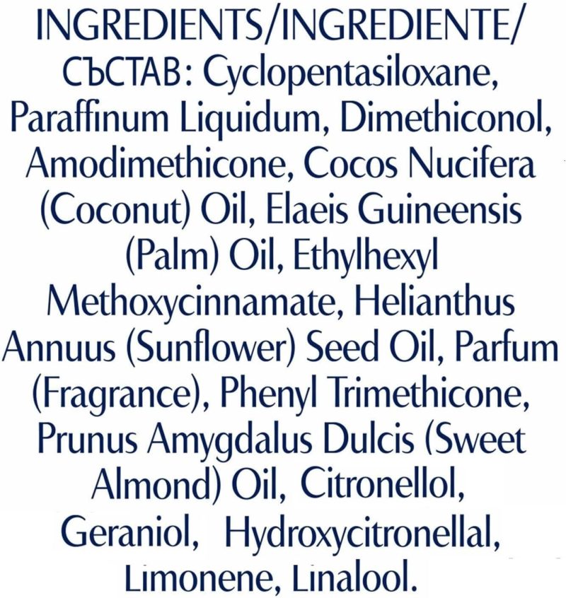 Cyclopentasiloxane, Paraffinum Liquidum, Dimethiconol, Amodimethicone, Cocos Nucifera (Coconut) Oil, Elaeis Guineensis (Palm) Oil, Ethylhexyl Methoxycinnamate, Helianthus Annuus (Sunflower) Seed Oil, Parfum (Fragrance), Phenyl Trimethicone, Prunus Amygdalus Dulcis (Sweet Almond) Oil, Butylphenyl Methylpropional, Citronellol, Geraniol, Hydroxycitronellal, Limonene, Linalool