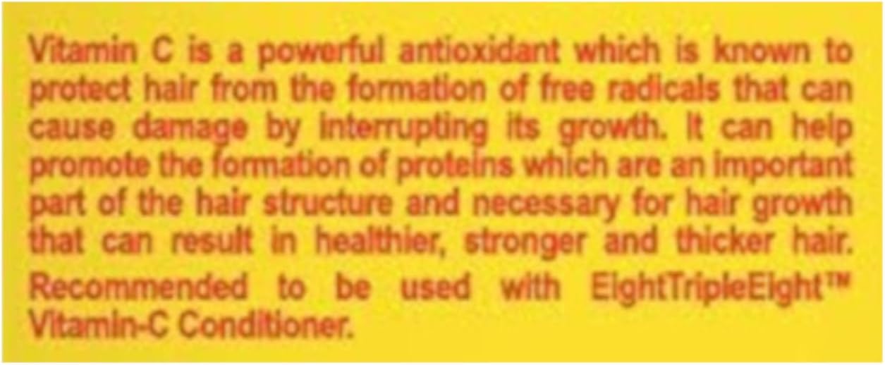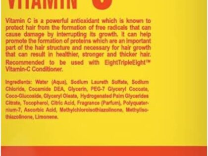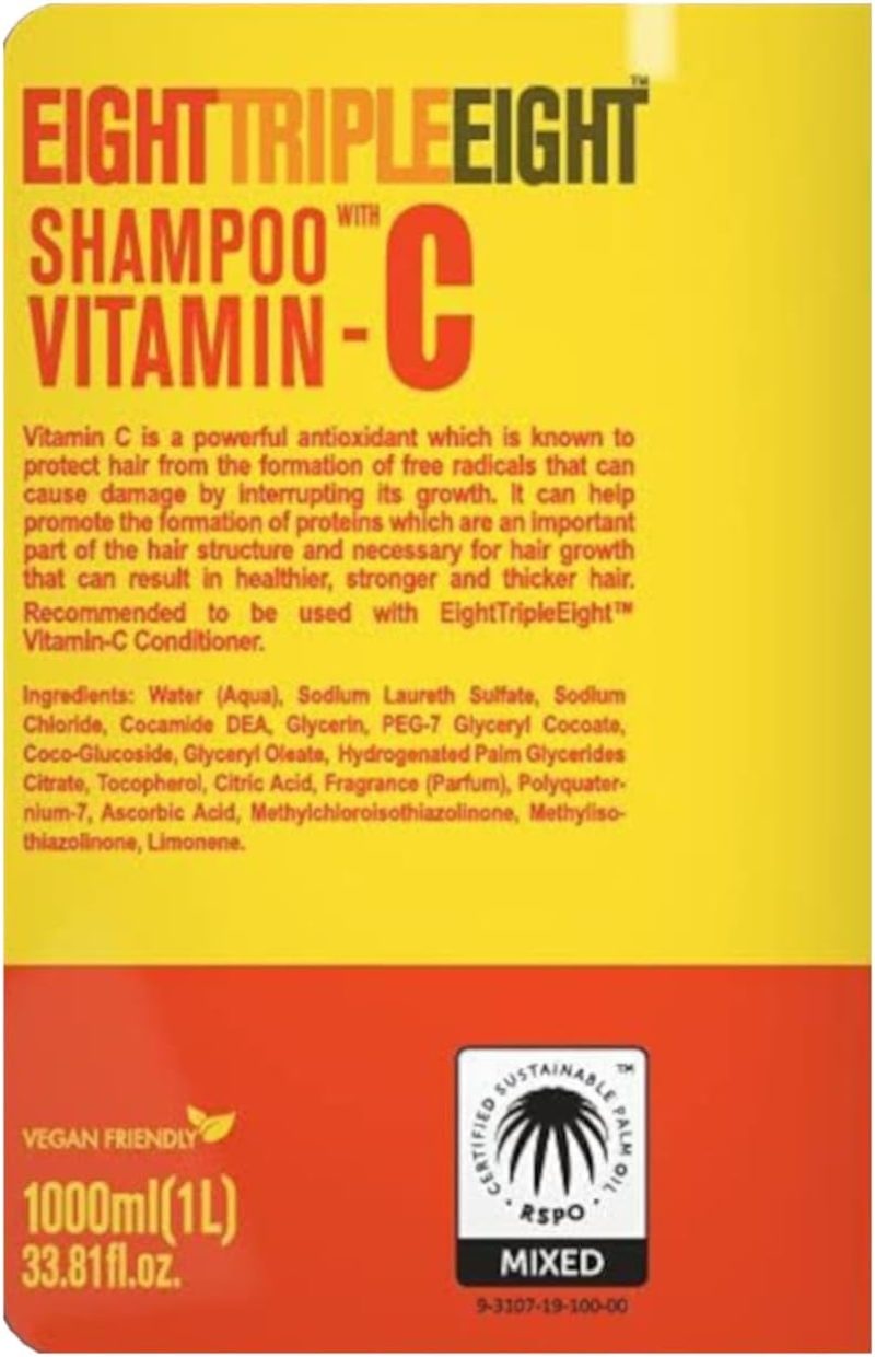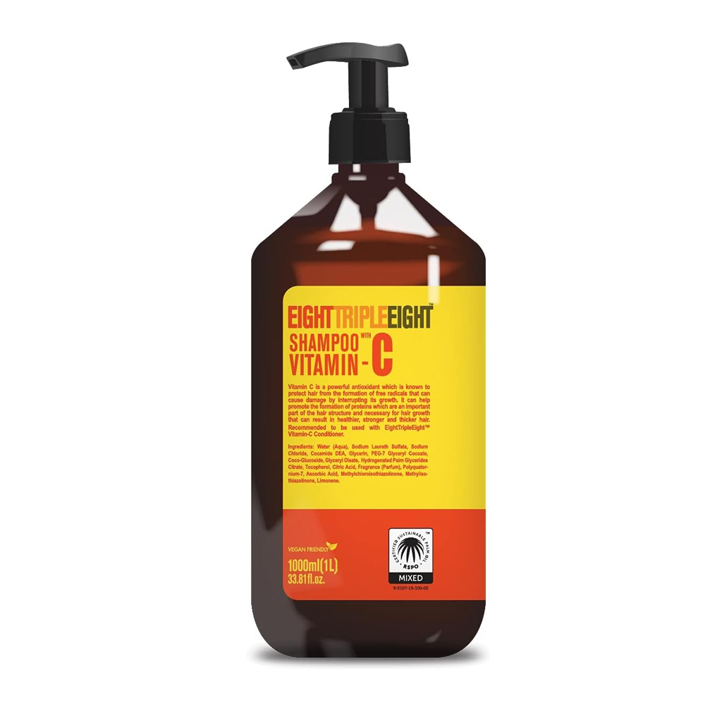 EightTripleEight Vitamin C Hair Care – 1L Shampoo Vitamin C is a powerful antioxidant which is known to protect hair from the formation of free radicals that can cause damage by interrupting its growth. It can help promote the formation of proteins which are an important part of the hair structure and necessary for hair growth. The end result being healthier, stronger and thicker hair. For best results it is recommended to use this set alongside each other EightTripleEight Vitamin C Conditioner/Shampoo. For all hair types. Paraben-free formulation. Dermatologically tested. Cruelty Free/No Animal Testing. RSPO Certified Sustainable Palm Oil. Country of manufacture: Poland. Unit type ml. Unit Quantity 1000ml.