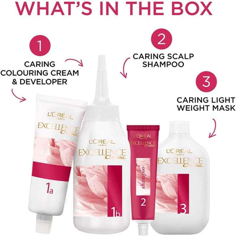 - Contents: 3x L’Oréal Paris Excellence Crème home hair colour sets in 02 Ultra-Light Golden Blonde, Each box includes: 1x caring colouring cream & developer, 1x caring scalp shampoo, 1x caring light weight mask and 1x comb applicator