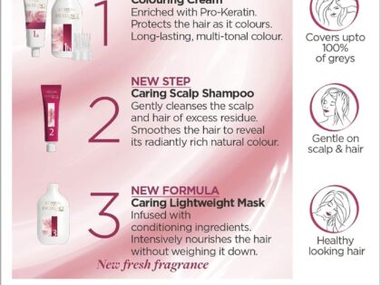 1207197 – Caring Colouring Cream: Aqua / Water, Cetearyl Alcohol, Propylene Glycol, Deceth-3, Laureth-12, Ammonium Hydroxide, Oleth-30, Hexadimethrine Chloride, Lauric Acid, Glycol Distearate, Polyquaternium-22, Ethanolamine, Silica Dimethyl Silylate [Nano] / Silica Dimethyl Silylate, CI 77891 / Titanium Dioxide, 2,4-Diaminophenoxyethanol HCL, m-Aminophenol, 5-Amino-6-Chloro-O-Cresol, Ascorbic Acid, Sodium Metabisulfite, Thioglycerin, Toluene-2,5-Diamine, Dimethicone, N,N-Bis(2-Hydroxyethyl)-p-Phenylenediamine Sulfate, Carbomer, Resorcinol, EDTA, Parfum / Fragrance. (F.I.L. C204250/1), 1187092 – Developer: Aqua / Water, Hydrogen Peroxide, Cetearyl Alcohol, Sodium Salicylate, Trideceth-2 Carboxamide MEA, Phosphoric Acid, Ceteareth-25, Tetrasodium Etidronate, Tetrasodium Pyrophosphate, Glycerin. (F.I.L. C202310/2), 1217017 – Caring Scalp Shampoo: Aqua / Water, Sodium Laureth Sulfate, Cocamidopropyl Betaine, Dimethicone, Sodium Chloride, Parfum / Fragrance, CI 77891 / Titanium Dioxide, Guar Hydroxypropyltrimonium Chloride, Mica, Coco-Betaine, Sodium Benzoate, Sodium Hydroxide, Phenoxyethanol, Steareth-6, Acetic Acid, PEG-100 Stearate, PEG-45M, Trideceth-10, Trideceth-3, Salicylic Acid, Fumaric Acid, Linalool, Benzyl Alcohol, Amodimethicone, Isoeugenol, Carbomer, Citric Acid, BHT, Hexylene Glycol, Hexyl Cinnamal, Glycerin, Glycol Distearate. (F.I.L. C226772/1), 1177657 – Caring Lightweight Mask: Aqua / Water, Amodimethicone, Stearyl Alcohol, Hydroxypropyl Starch Phosphate, Isopropyl Myristate, Behentrimonium Chloride, Cetyl Alcohol, Hydroxypropyltrimonium Hydrolyzed Wheat Protein, Phenoxyethanol, Acetic Acid, PEG-150 Distearate, Trideceth-5, Trideceth-6, Trideceth-10, Panthenol, Linalool, Benzyl Alcohol, Isopropyl Alcohol, Isoeugenol, 2-Oleamido-1,3 Octadecanediol, Caprylyl Glycol, Cetrimonium Chloride, Hexyl Cinnamal, Glycerin, Parfum / Fragrance. (F.I.L. C223464/1)