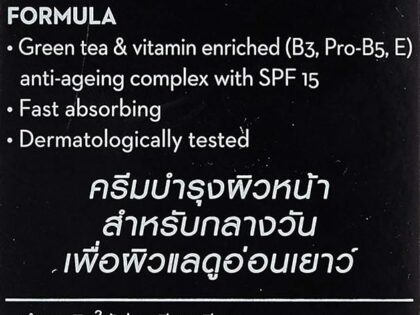 A fresh versatile anti-aging day cream for normal skin With a lightweight non-greasy & rapid-dissolving texture. Formulated with Vita Niacin that delivers vitamins & mineral essence. Helps to accelerate metabolism of skin & restore It’s natural repairing power. Contains natural Green Tea extract to consolidate skin’s barrier system Shields skin against damaging sun rays with broad spectrum SPF 15 UVA/UVB sunscreen Minimizes appearance of fine lines wrinkles blotches & dark spots Unveils a firmer softer smoother brighter & even-toned younger looking complexion.